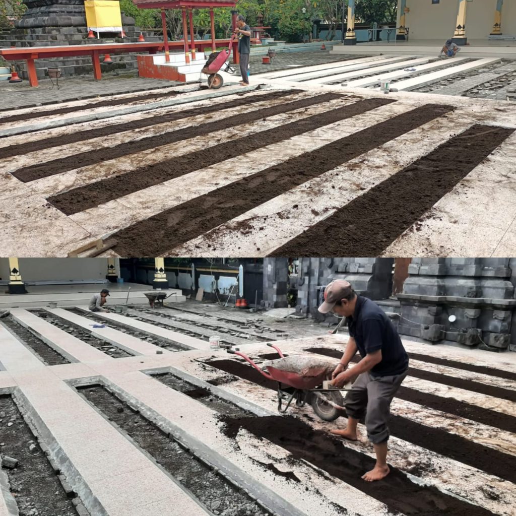 pemasangan keramik untuk umat sembahyang agar lebih nyaman & gelar tanah untuk tanam rumput gajah